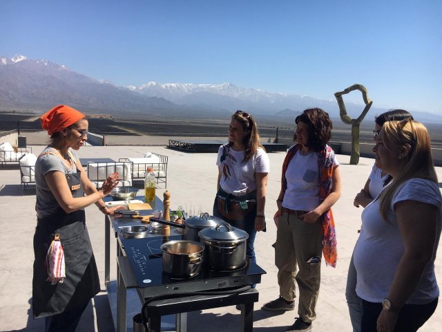 In the morning we will leave to the Uco Valley area, where you are received in the Espacio Monteviejo offers the cooking classes dictated by the renowned chef Nadia Harón. Surrounded by the beauty of Los Andes mountain and in a relaxed and familiar atmosphere our cooking classes take place on our terrace on the third floor of the winery in its West site.